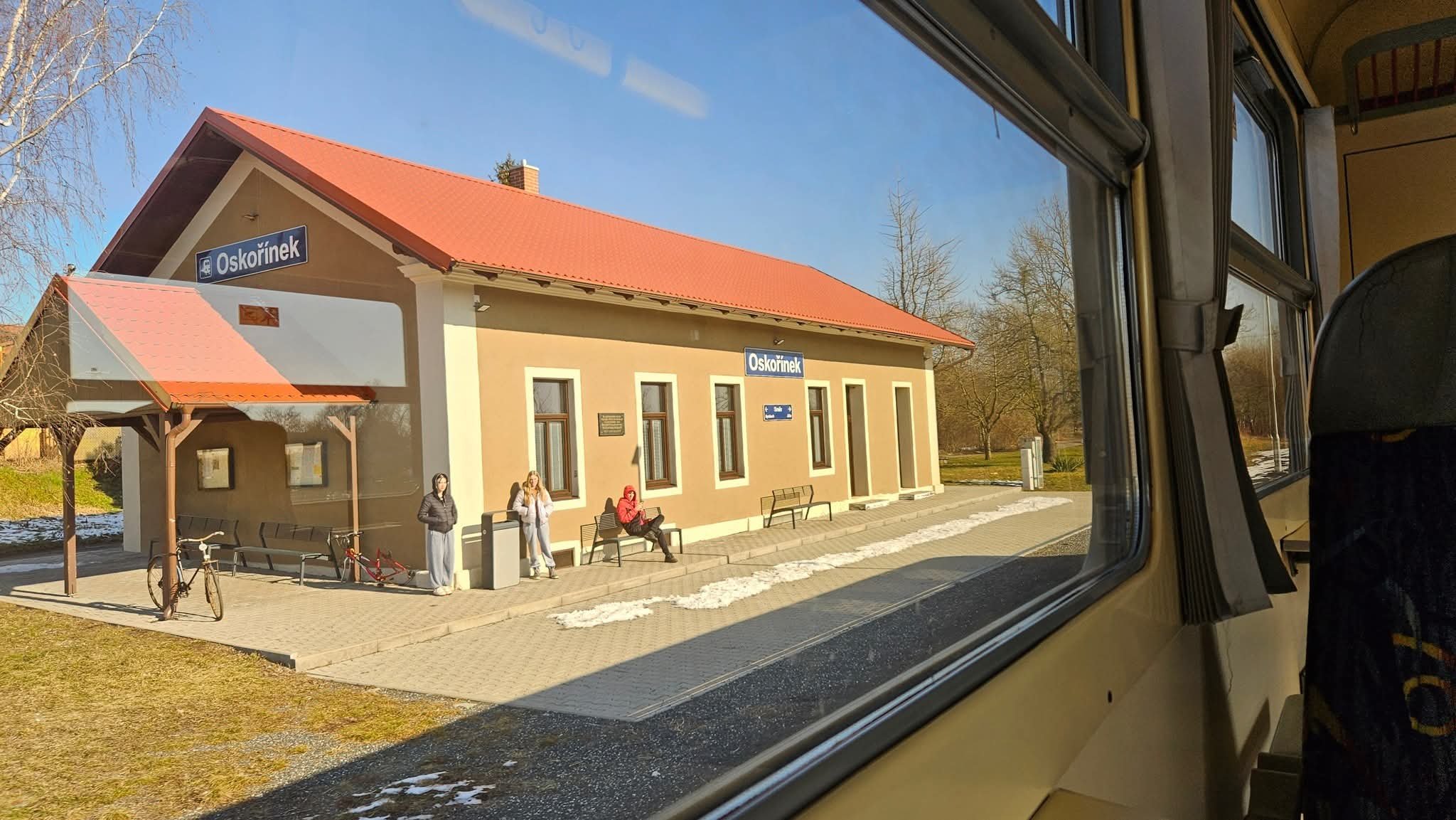 Trať opouští Nymburk a hned za městem se od ní odděluje trať na Mladou Boleslav. My ale pokračujeme placatou krajinou mezi poli přes Veleliby a Oskořínek do Křince. Tam se nejspíš budeme křížit s vlakem odnaproti. Za Křincem, v lese na odbočce Obora se doprava odděluje trať na Městec Králové a Chlumec nad Cidlinou. Ještě tak před třemi lety jsme tudy jeli, ale to už je historie - v roce 2022 ji stihl osud mnoha dalších tratí, kde zrušili provoz. V Rožďalovicích je pěkná výpravní budova. Za nimi se trať začne výrazně klikatit a vlak klepe přes mezery v kolejích a hází sebou ze strany na stranu. Projíždí se pěkným lesem, za kterým se vineme podél lesa po polích až do Kopidlna. Ještě předtím ale míjíme odbočku na Dolní Bousov a Bakov nad Jizerou - další trať se zrušeným provozem, která má ale naději, že na ní soukromý dopravce obnoví aspoň sezónní provoz. Z Kopidlna drncáme podél potoka ke stanici, která se ještě celkem nedávno jmenovala Bartoušov. Zřejmě proto, že Bartoušov uz zastávku má a tahle stanice je blíž Žitětínu, ji ale přejmenovali. Z dalších stanic stojí za zmínku Nemyčeves. To je zastávka v polích mimo obec, která se pyšní malou ale pěknou budovou. Nový odpadkový koš je tu snad jedinou změnou od doby, kdy jsem tudy jezdil jako kluk. Tady se už otvírají pohledy na malebné Jičínsko. Nejdřív vykoukl vrch Veliš a pak už je vidět Jičín a za ním celá ta kopcovitá paráda: Prachovské skály, Košov, Tábor, Zebín, Bradlec a Kumburk. A úplně vzadu Krkonoše.