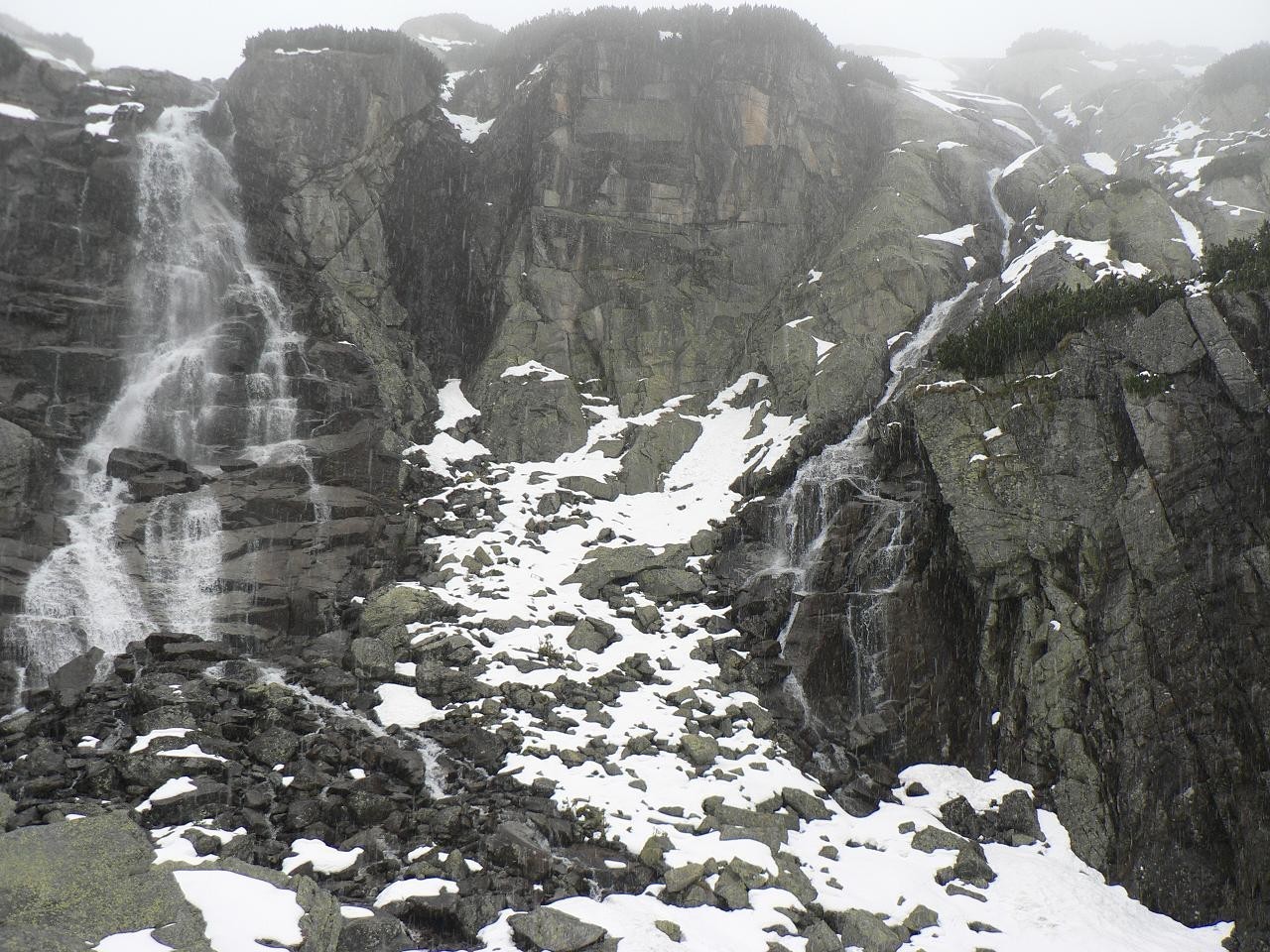 Vycházíme ze Štrbského Plesa k hotelu Fis nedaleko skokanských můstků. Odtud již lesní, hodně kamenitou cestou, jdeme Mlynickou dolinou po žluté značce. Poslední budovou je zastřešený vodní zdroj po pravé straně a poté již následuje smrkový les. Ten je stále nižší a řidší a postupně se mísí s klečí. Občas věnujeme obdiv borovicím limbám a posléze se dostaneme pouze do království kosodřeviny. Odtud se otevírají pohledy, jak na okolní štíty tak i k jihu do hlubokého údolí. Bohužel dnes je pro nás většina těchto pohledů ukryta v mracích šedočerného zabarvení, ze kterých stále více prší. Pár set metrů od vodopádů je již cesta pokrytá sněhem a také déšť přechází do pevného stavu. Jsme u vodopádu a jen na chvíli je nám dovoleno udělat pár fotek. Po několika minutách jej překrývá sněhová záclona a jsme rádi, že vidíme alespoň na cestu. Sněhu přibývá a stává se z něj souvislá pokrývka. Je nepříjemně mokrý a vítr jej přímo s rozkoší na nás lepí bez ohledu, že máme pláštěnky. Mokro začíná být i v botách a tak jsme rádi, že jsme zpátky ve vyšším lese. Sníh se opět mění v déšť a naše cesta se proměnila v docela slušný potok. Konečně asfalt pod nohama je tentokrát přijat s povděkem a nádraží ve Štrbském Plese je milým zakončením cesty k vodopádu Skok.