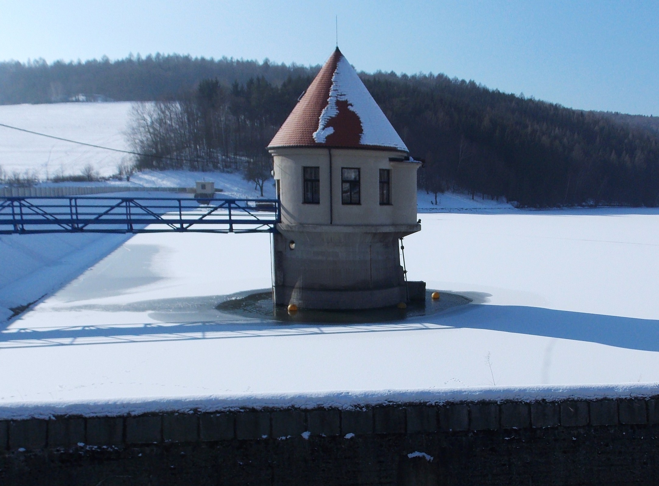 Přejdeme silnici a jdeme k začátku vodní nádrže a hrázi, na kterou je vstup zakázán. Podél břehu jdeme kousek po silnici, a pak vstupujeme na břehy nad přehradou, v únorovém měsíci úplně zapadané sněhem. Nám to ale nevadí, mezi stromy jsou krásné zákoutí a průhledy na přehradu, nad námi nádherně modré nebe a sluníčko, takže se tudy projdeme ke konci nádrže a opět vycházíme u silnice. Zpět se vracíme každy jinou cestou, je to asi 10 minut zpět k autobusové zastávce, Franta jde po silnici a já stejnou cestou a fotím si tak detaily mezi stromy a výhledy na přehradní zasněženou hladinu. Škoda, že je tak zamrzlá a nejde vůbec vidět voda. Pak společně pokračujeme uličkou mírně do kopečka a procházíme mezi výstavbou do středu obce Kostelce u Zlína. Kostelec je skoro malé městečko zajímavé svým hotelem se známými lázněmi. Lázně stojí v Kostelci na návrší nad silnicí ze Zlína na Fryšták, léčí v nich pohybový aparát, revmatismus, atd. K dispozici mají hosté i golfové hřiště a bazén na loukách pod hotelem. Od středu dojdeme až na začátek Kostelce, kde se zastavujeme v místní restauraci U Staňků na pivo a chvíli se zahřát před odjezdem zpět. Kousek odtud ze zastávky MHD se vracíme spojem do Zlína.