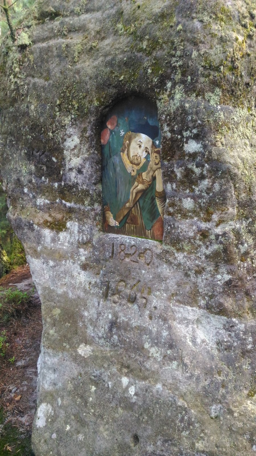 Cesta vychází na silnici v Rynalticích. Odbočuji na modře značenou cestu, která prudce schází do údolí říčky Chřibská Kamenice, do Pavlínina údolí. I zde na skále u cesty je malá skalní kaplička.