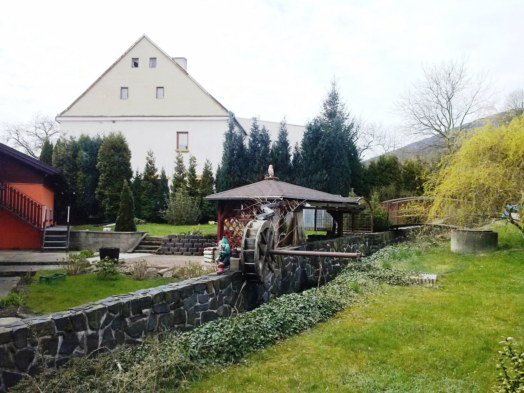 Prošly jsme okolo domku se zahradou, jež zdobí u mlýnského kola umně provedený hastrmánek nad úzkým, kamenem obloženým potůčkem. I další besídka a okrasná zahrádka nad ním potvrzuje, že majitel tohoto pozemku má šikovné ruce…
