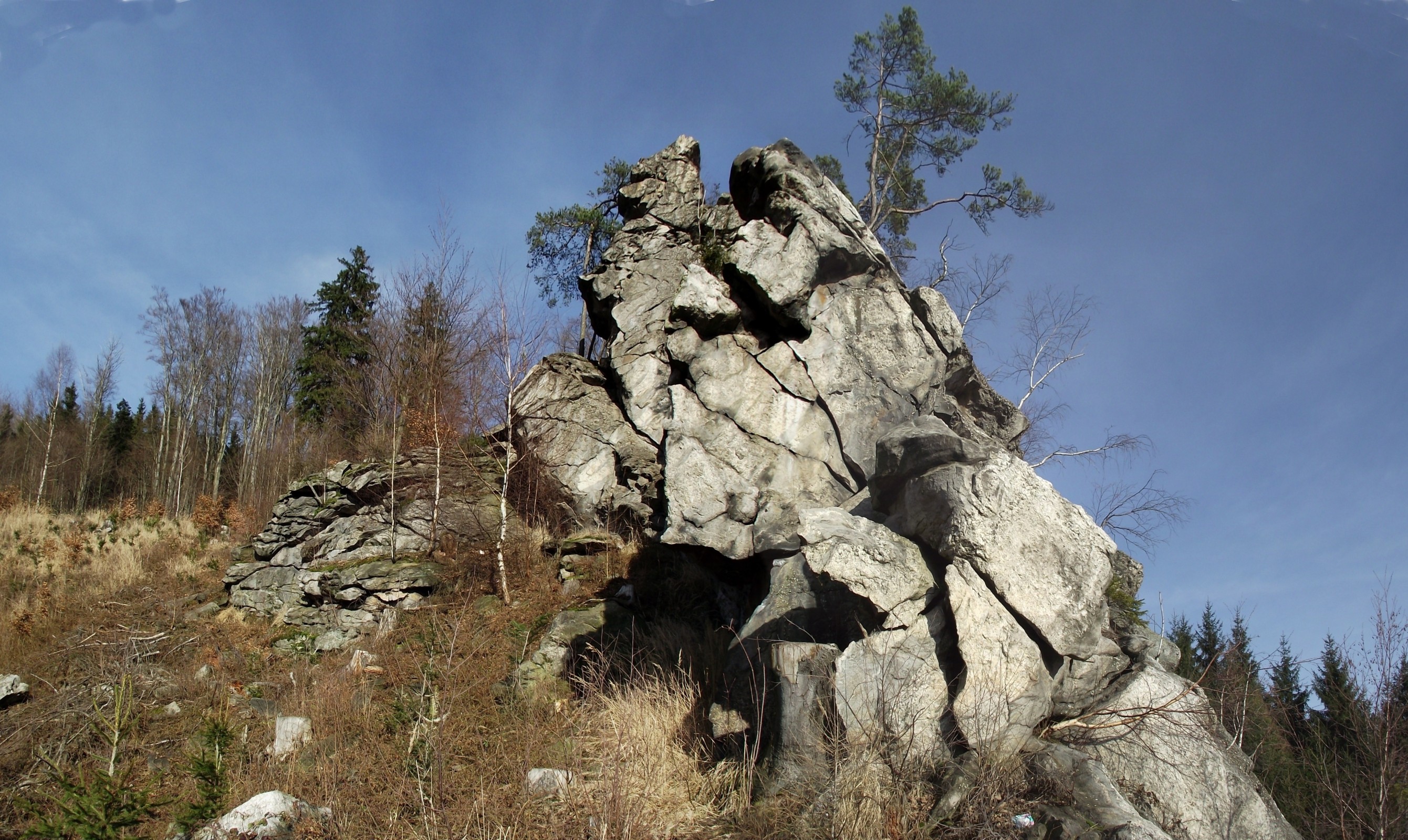 Toto místo jsem hodlal blíže prozkoumat už dávno, jak jsem zde koneckonců přiznal již dříve. Kolem jsem totiž procházel již několikrát, ale nikdy mi nějak nezbyl čas. Tentokrát jsme navíc cestou potkali i další skalky, které jsem zatím vždy tak nějak přehlédl. A nemohu to svádět jen na fakt, že v letošním roce se dá v přírodě toulat – díky nadprůměrným venkovním teplotám – podstatně dříve. Je pravda, že chybějící zeleň odkryje mnohý nečekaný pohled, i to, že jsem tudy často procházel v mlze, kdy nebylo na krok vidět. Ale tím hlavním důvodem je smutný fakt, že zvláště v místech, která člověk důvěrně zná, se prostě občas nedívá nebo nevidí. Vždyť i článek na Turistice o této skále pochází z Valašska.