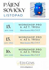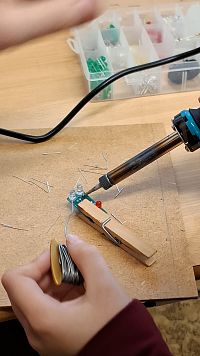 Našim cílem byl workshop pájení sovičky. Šli jsme si vyrobit svítící sovičku, kterou si děti sami napájely. Dozvěděli jsme se také, co to je LED a jak jí správně zapojit. Na začítku jsme si poslechli krátkou pohádku, která nám vysvětlila, proč v obvodu musíme používat rezistor a na co si dát pozor při zapojování LED.