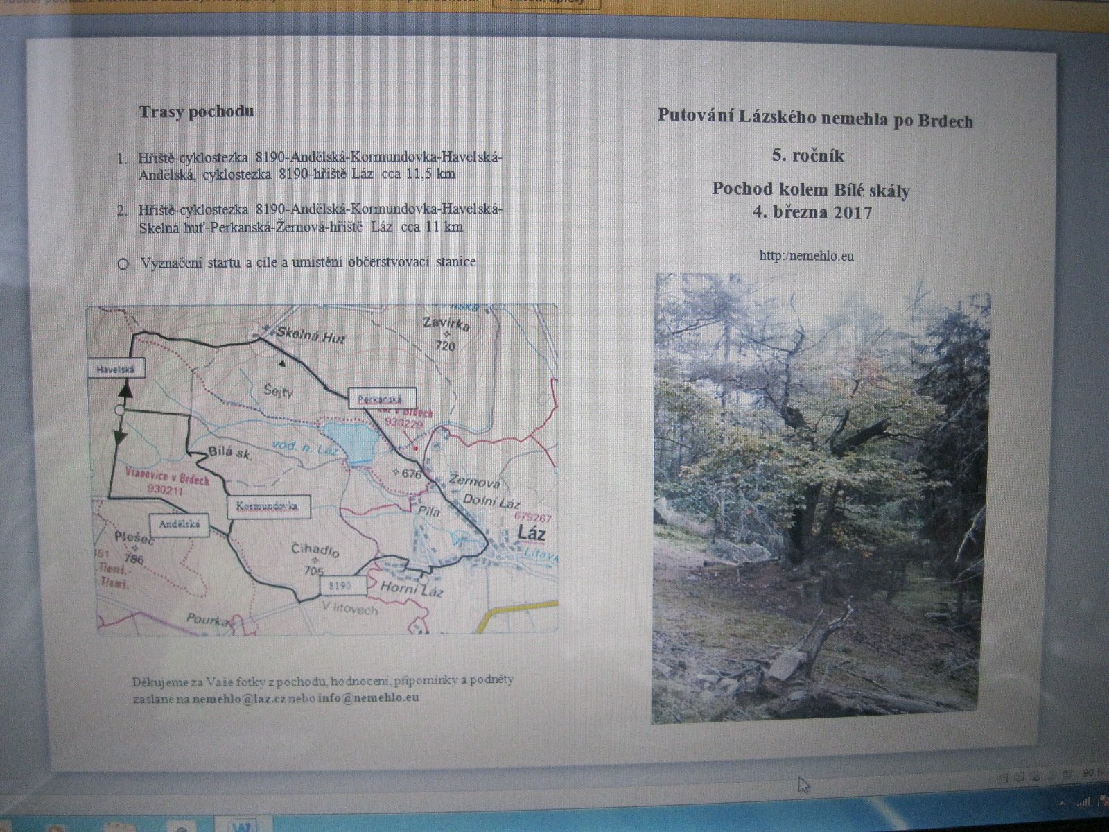 setkání příznivců pěší turistiky. Protože spisovatel Ladislav Stehlík obdivoval Rožmitál pod Třemšínem a vesničky kolem, zvolili jsme pochod Lázského nemehla kolem Bílé skály jako desátou etapu našeho putování. Na místo startu se nám podařilo přijet o hodinu dříve a tak jsme pořadatelům nabídli pomocnou ruku při přípravě startu. Poté jsme se trochu občerstvili v klubovně TJ Sokol Vrtule Láz. Trasa příjemné 11,5 km dlouhé vycházky byla: Láz hřiště - Andělská - Kormundovka - Havelská - Skelná Huť - Perkanská - hřiště Láz. A tak vzhůru k Bílé skále po uvedených bodech trasy. Opravdu příjemná procházka brdskými lesy, kdy bylo docela teplo a pěkně na nás korunami lesního smrkového porostu prosvěcovalo sluníčko.Postupně jsme se dostali na kontrolní stanoviště, kde bylo možné do vlastních hrnečků načepovat velmi chutný čaj, odpočinout si, posvačit a potom vpravo po Havelské cestě sestupovat ke Skelné Huti. Dále jsem šli po Perkanské cestě kolem vodní nádrže Láz do Dolního Lázu a do cíle na hřišti TJ Sokol Vrtule Láz. V cíli přišly k chuti opečené klobásy a třeba pivko nebo nějaký ten nealkoholický nýpoj. Společně s pořadateli jsme si mohli zazpívat hymnu Lázského nemehla. Pak naše cesta vedla k domovům s tím, že příští rok určitě zase přijedeme. Každého, kdo má rád brdské lesy, legraci a dobré lidi srdečně zveme na příští již šestý ročník Lázského nemehla. ZA TK Blamiš Vladimír Vildt.
