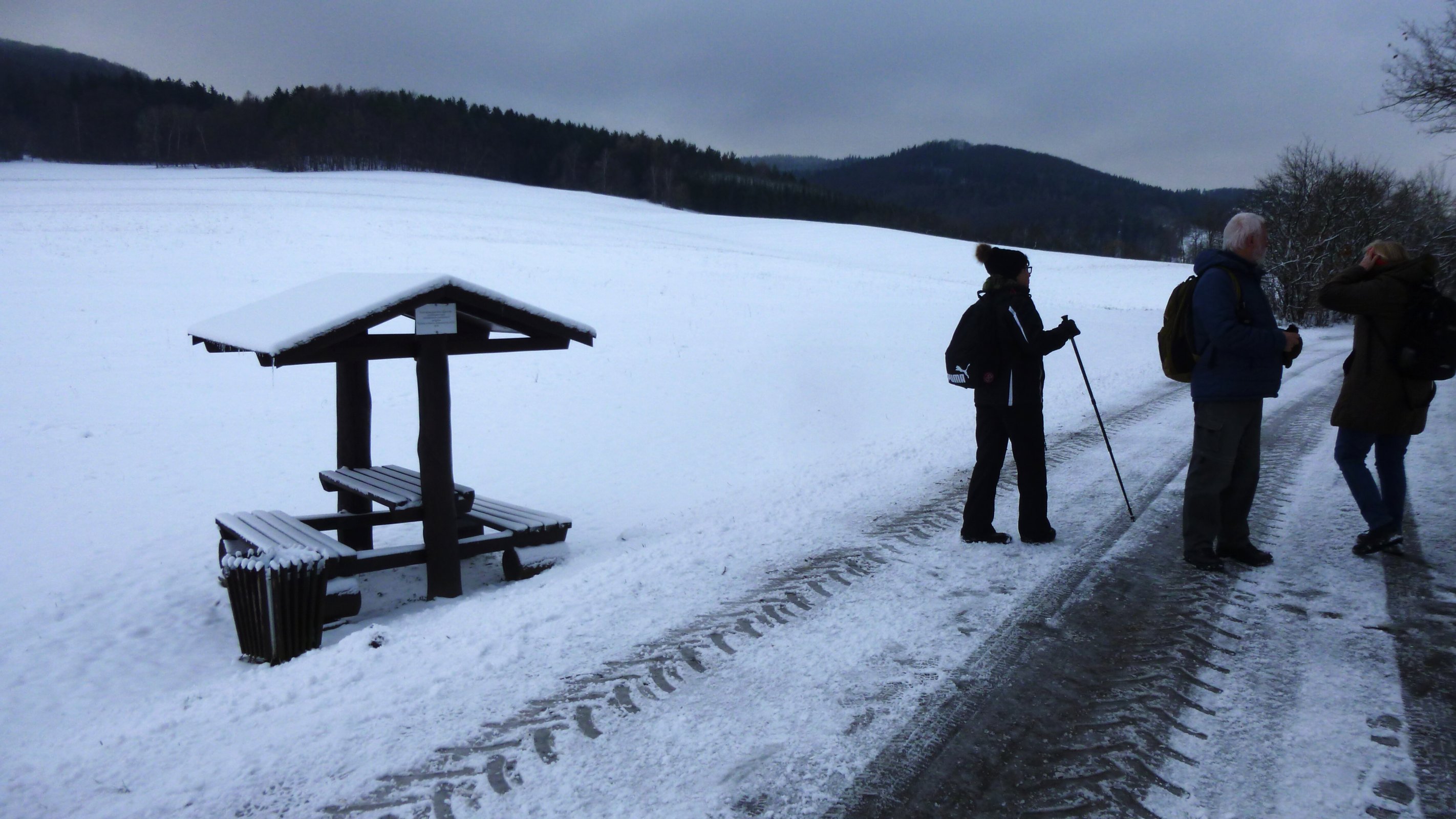 Jedeme se jen tak projít bez značené trasy údolím pod značenou trasou (Zelená) Bratřejov- Klášťov. Je krásný zimní den a sníh nám křupe po nohama.