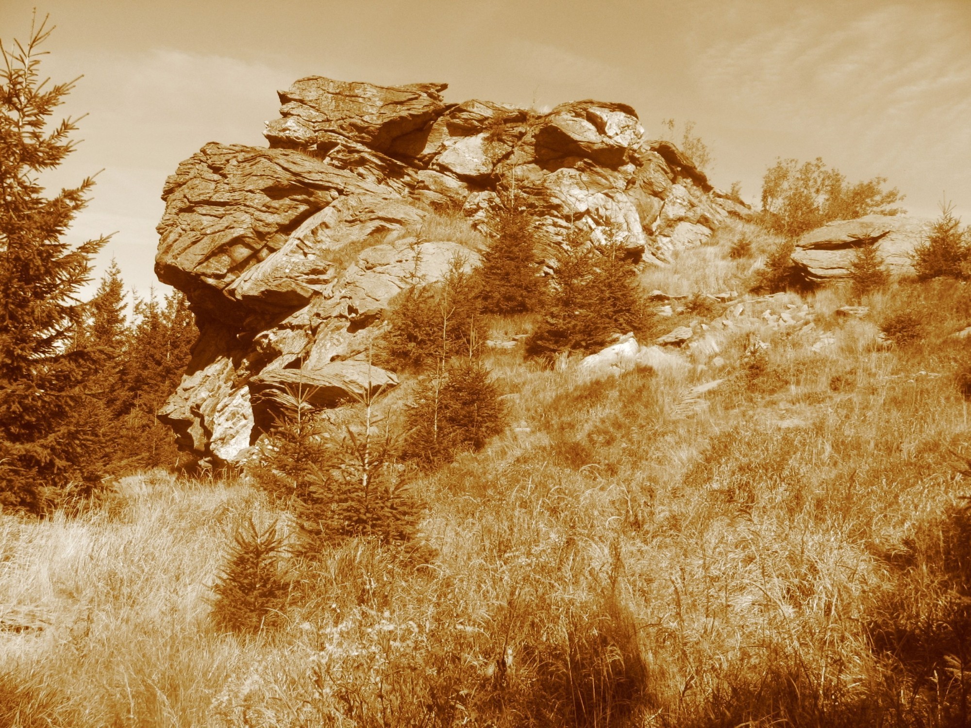 Tento skalní útvar a i ty ostatní v nejbližším okolím jsou v dnešním krásném dny pohádkově nasvíceny a my si tu krásu opravdu naplno vychutnáváme ! Pobíháme mezi skalisky, tvořenými krystalickými břidlicemi, fotíme detaily jednotlivých skal, obdivujeme překrásné provrásnění některých partií a radujeme se z výhledu Na Praděd a část jesenického hlavního hřebene. Já pak ještě nahoru na temeno "hlavní" skály, odkud musel být ještě nedávno nádherný kruhový výhled na celé Jeseníky a jejich podhůří s městem Bruntál, přehradou Slezskou Hartou a sopkami Nízkého Jeseníku. Dnes už kruhovému pohledu brání vzrostlé mladé smrkové stromy, mezi nimiž se postupně ztrácí i některé, ještě před pár lety viditelné útvary skalního města. Brzy přijde doba, kdy bude tento výhled čím dál omezenější a tak, jestli se chcete pokochat stále ještě "božským pohledem" na nejkrásnější místa Jeseníků - oblast Pradědu - a míň známých turistických míst - zalesněnou oblast Medvědího vrchu a Orlíku, plnou skal - neměli byste dlouho otálet !!
