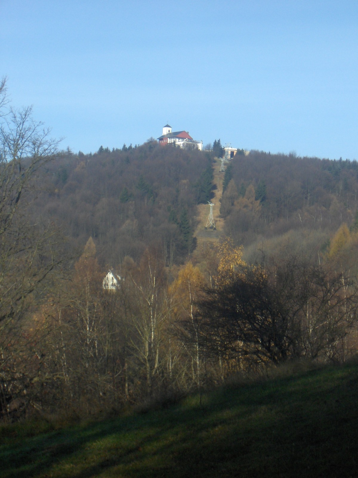 Vycházím z vrcholu Komáří hůrky, kam se dá vyjet lanovkou nebo autobusem, který má zastávku v sedle pod vrcholem.