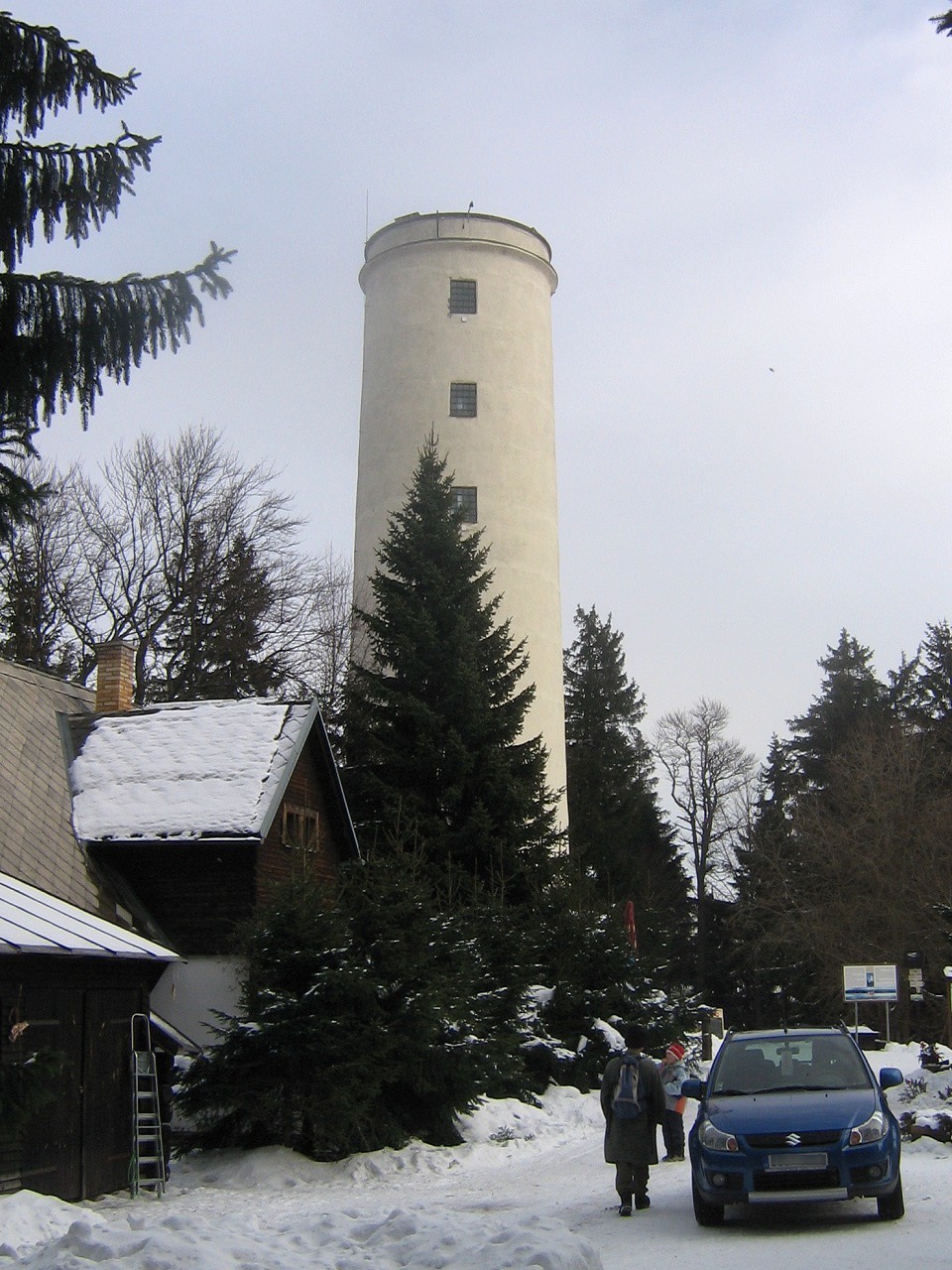 Vystupujeme z vlaku na zastávce s malou dřevěnou čekárničkou na jižním okraji Prachatic. Stoupáme mezi domy až k bývalým lázním sv. Markéty, které už dnes nefungují a bohužel i část bývalého areálu již podlehla zubu času. My se ale nezdržujeme a stoupáme strmě lesem až k rozcestí Nad Lázněmi, které je přímo nad zatáčkou silnice na Libínské Sedlo. Cesta stále stoupá, procházíme kolem rozcestí Na Hřebenech. Občas se, v místech kde je les vykácen, otevře pohled na zamlžené Prachatice. I sněhu přibývá, takže je cesta poměrně náročná. Brzy se mezi větvemi objevuje rozhledna, která mi trochu svou stavbou připomíná maják...