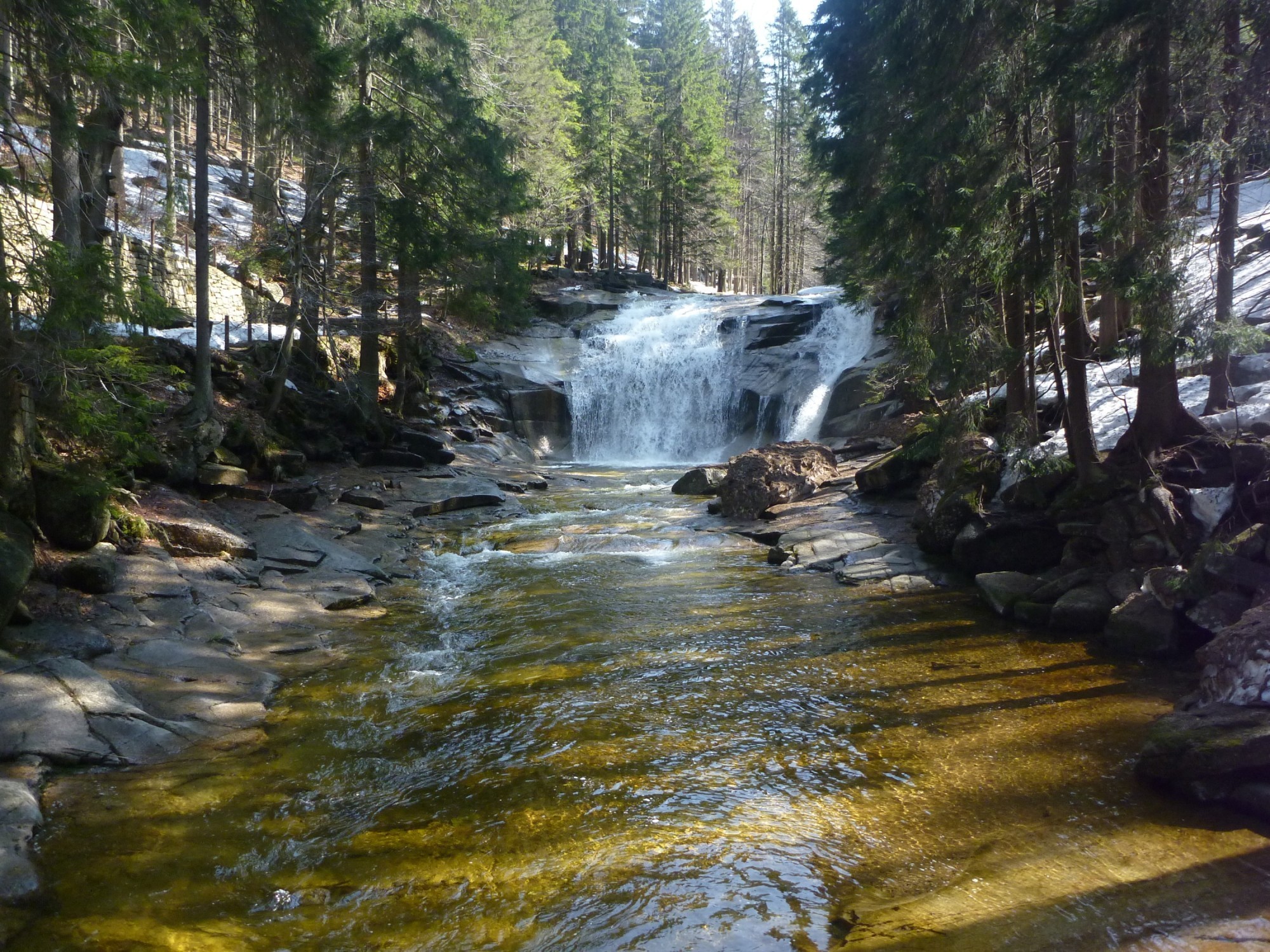 Cesta vede kolem zatarasených jam, které vznikly propadem do bývalých harrachovských štol. K vodopádům přicházíme od lesa přes lávku, odkud je vodopád vidět asi nejlépe. Máme slunečno, takže je vše krásně prosvícené. Původně jsme měly jiný plán, ale sekly jsme se v občerstvení U Lišáka na svařáku, tak jsme se rozhodly, že se pokusíme vyjet na Čertovu horu lanovkou, i přes to, že nám bylo řečeno, že když se lyžuje, tak pěšáky neberou