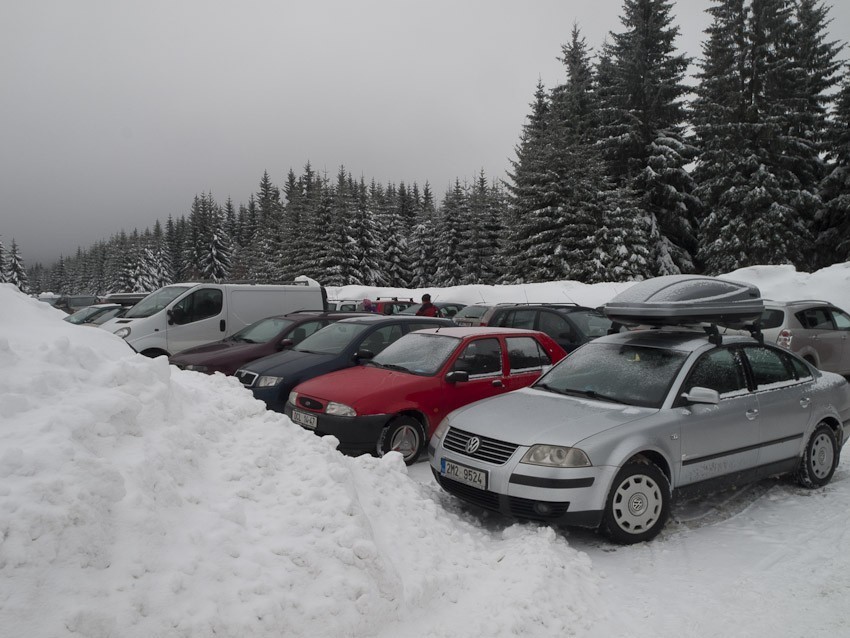 Bohužel o víkendech je na Skřítek z naší strany dosti mizerná veřejná doprava (vlastně skoro žádná), první autobus 6.40, co chcete na horách dělat v zimě v 7 ráno za tmy. Naštěstí kamarádka vyprosila auto, čili proti našemu zvyku musíme využít výplod civilizace a navíc se musíme vrátit na stejné místo (to není žádná turistika).