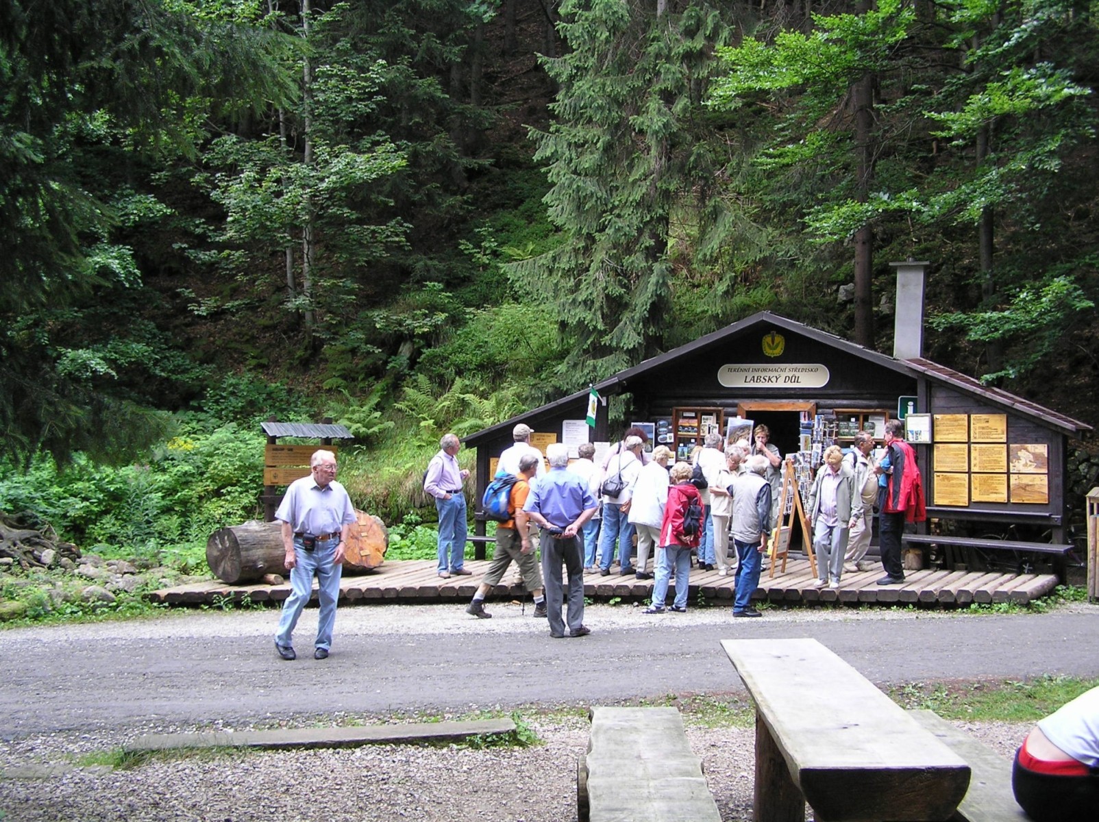 Vyrazili jsme z Pece do Špindlerova mlýna autobusem, přestup ve Vrchlabí. Ve Špindlu procházíme proti toku Labe po jeho pravém břehu hledat místo, kde stávala bouda U Dívčí lávky. Hledání žádné nebylo protože na místě stojí infocentrum KRNAPU a velice ochotná paní nám vysvětlila, kde co stálo a měla i obrázky. Dále procházíme přes můstek k boudě Kovárna a stejnou cestou zpět do centra. Po silnici a odbočkou kolem lanovky zacházíme do Svatého Petra podívat se na bývalou podnikovou chatu, je součástí hotelu a po rozhlédnutí po Sv. Petru se vracíme k lanovce a vyjíždíme na Pláně, po modré zn. k Boudě na Pláni na malé občerstvení a dále po zelené zn. na Klínové boudy a k Chalupě na Rozcestí, opět se občerstvujeme a pokračujeme po červené kolem Výrovky na silnici a zelenou zn. do Pece.
