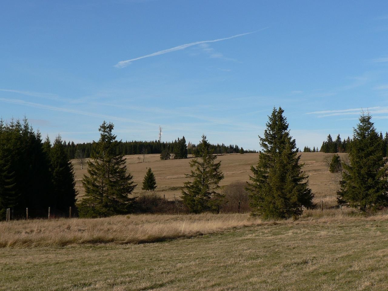 Listopadové ráno na Horské Kvildě nás nevítalo zrovna přívětivě. Nu, vždyť jsme na jednom z nejchladnějších míst v zemi. Ale sluníčko postupně rozehřívalo stříbrnou jinovatku na již zežloutlých loukách, když jsme od hostince u Honesů vycházeli po zelené značce k jihu. Od pradávna tudy vedla Zlatá stezka a lze tvrdit, že některé úseky cesty nedoznaly změny po celá staletí. Louku vystřídal les a po chvíli se přiblížila i horská silnička. Vlevo od nás je mezi stromy sotva znatelný vrchol Břemena ( 1156 m.n.m.) a na stejné straně se po chvíli objevují louky. Přicházíme na rozcestí se žlutou a jsme v místech, kde stávala osada Zhůří. Bylo to několik domků a kaple. Po osadě zůstaly jen sporá torza domků. V době totality zde stála radarová stanice. Odtud již vidíme vrchol Huťské hory ( 1187 m.n. m.),na který po loukách vystupujeme.