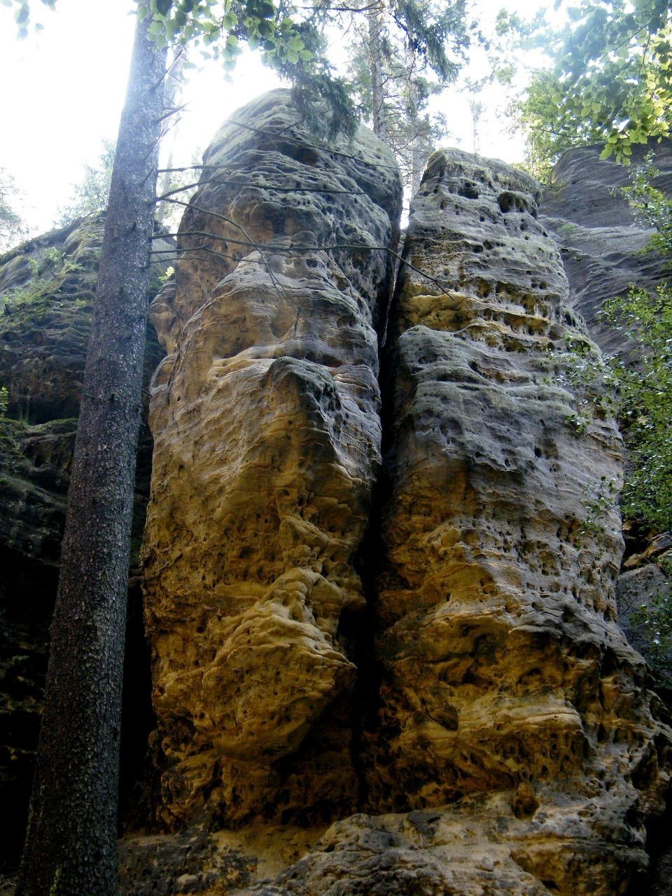 Procesí, které se na žlutou značku sbíhalo už od hotelu se nám moc nezamlouvalo. Lidí bylo čím dál víc, však už začínala sezóna. Ale rozcestí nás uklidnilo. Takřka všichni spěchali ke krkolomné cestě na hrad a na nás zbyla pohodlná a mírně stoupající silnička postupující směrem východním. Dav zmizel, jen snad několik místních houbařů s nepříliš plnými košíky jsme potkali a několik cyklistů nás předjelo. Však je to tu i cyklostezka. Z mapy i z příležitostných informačních tabulí jsme zjistili, že jdeme po Vysokolipské silnicí, která byla obchodní stezkou už ve středověku. A sem tam se už nějaká sympatická skalka u cesty začala objevovat. Poměrně záhy ale značka silnici opouští a odbočuje na Českou silnici. Ta není asfaltová, zpočátku stoupá do skal, ale je vzápětí,(alespoň pro pěší, koňské a volské potahy starých kupců to na to měly asi jiný názor) příjemnější. Vine se pod skalami v příjemných zákrutech, tu převis s voštinami, tu strádající borovici na skále člověk vidí.